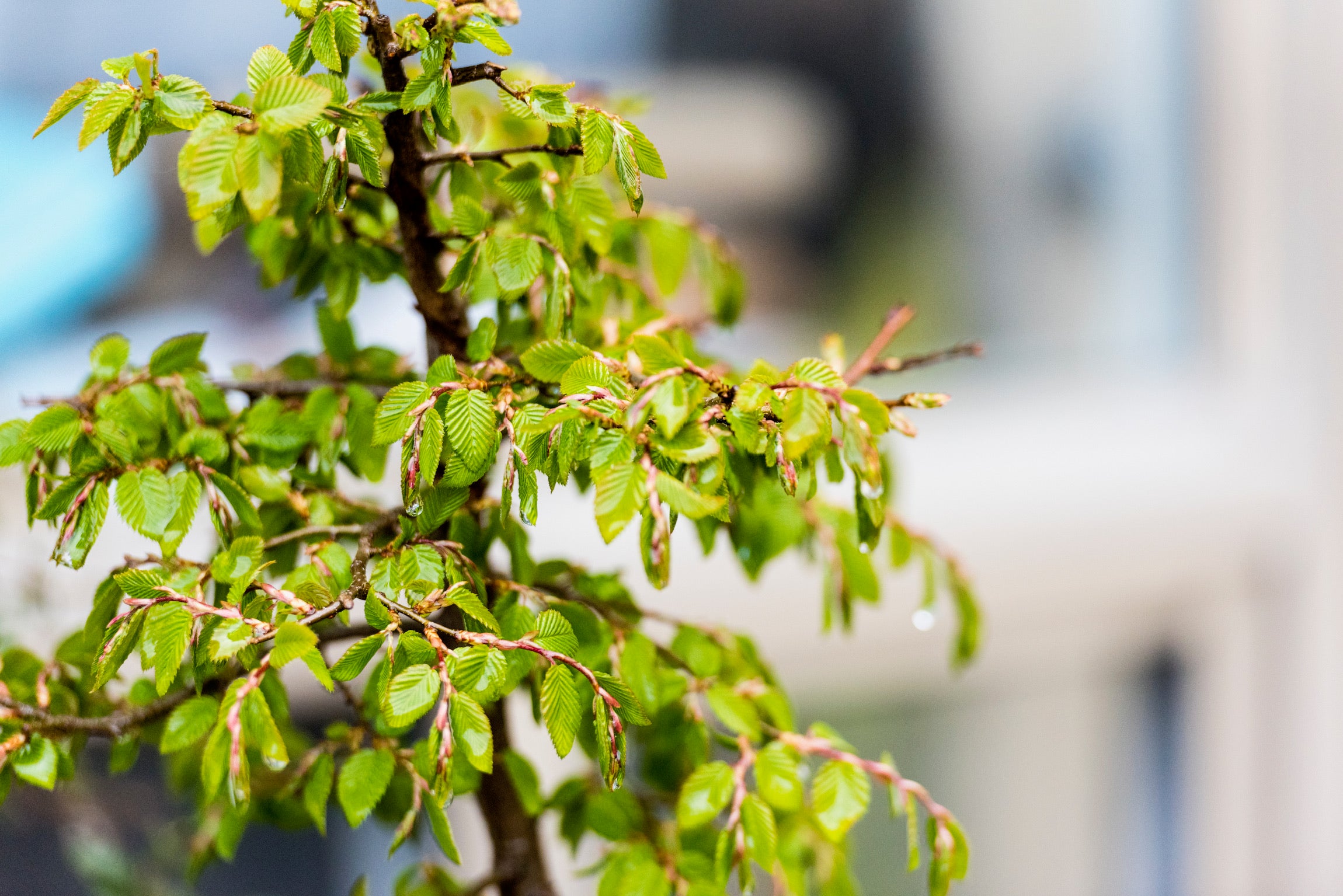 Although you generally want the colour and texture of a pot to match some characteristic of the tree, sometimes contrasts can work very well, for example, the red leaves of a red-leaved trees work well with a blue pot.